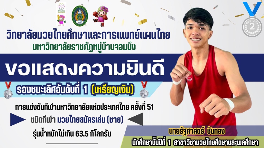 ขอแสดงความยินดีกับ นายรัฐศาสตร์ ชันทอง นักศึกษาชั้นปีที่ 1 การแข่งขันมวยไทยสมัครเล่น กีฬามหาวิทยาลัย รุ่นน้ำหนักไม่เกิน 63.5 กิโลกรัม เป็นอีกหนึ่งนักกีฬาที่แสดงให้เห็นถึงพลัง ความมุ่งมั่น และศักยภาพของเยาวชนชาวจอมบึง