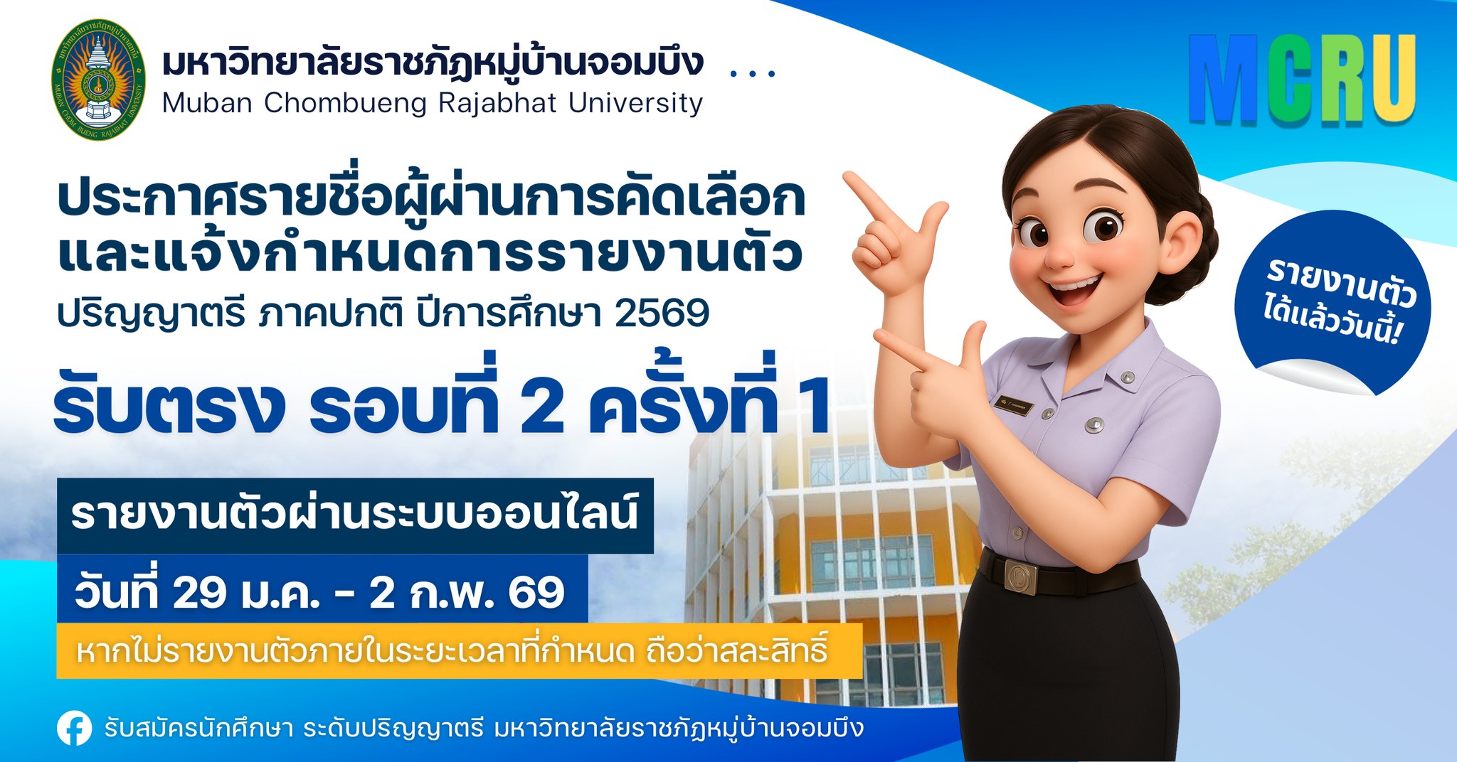 มหาวิทยาลัยราชภัฏหมู่บ้านจอมบึง ขอประกาศรายชื่อผู้ผ่านการคัดเลือกเข้าศึกษาเป็น นักศึกษาภาคปกติ ระดับปริญญาตรี ประจำปีการศึกษา 2569 รอบที่ 2 ครั้งที่ 1 พร้อมแจ้งกำหนดการรายงานตัวสำหรับผู้ผ่านการคัดเลือกทุกคน