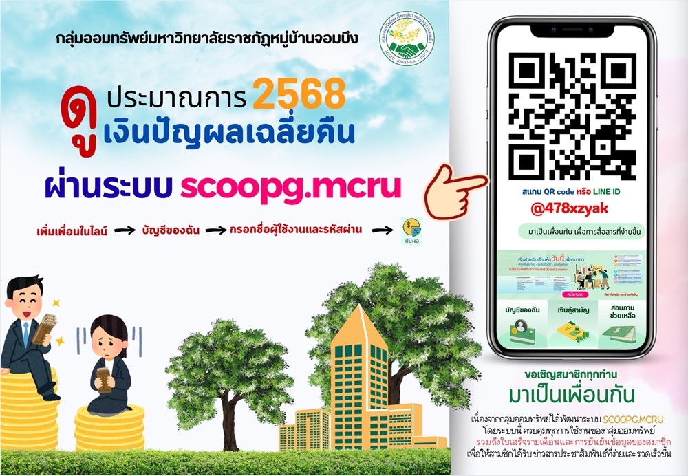 กลุ่มออมทรัพย์มหาวิทยาลัยราชภัฏหมู่บ้านจอมบึง แจ้งให้สมาชิกทุกท่านทราบว่า ขณะนี้สามารถ ตรวจสอบประมาณการเงินปันผลและเงินเฉลี่ยคืน ประจำปี 2568 ได้แล้วผ่านระบบ SCOOPG.MCRU เพื่อความสะดวกรวดเร็ว โปร่งใส และง่ายต่อการใช้งานของสมาชิกทุกคน