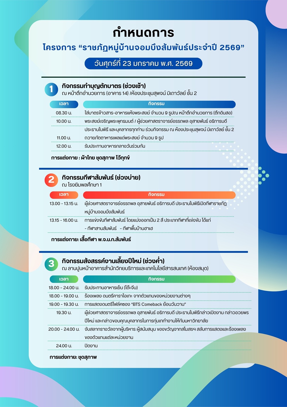 มหาวิทยาลัยราชภัฏหมู่บ้านจอมบึง กำหนดจัด โครงการ “ราชภัฏหมู่บ้านจอมบึงสัมพันธ์ ประจำปี 2569” ในวันศุกร์ที่ 23 มกราคม พ.ศ. 2569 เพื่อส่งเสริมความสัมพันธ์อันดี ความสามัคคี และการมีส่วนร่วมระหว่างผู้บริหาร คณาจารย์ บุคลากร และหน่วยงานภายในมหาวิทยาลัย