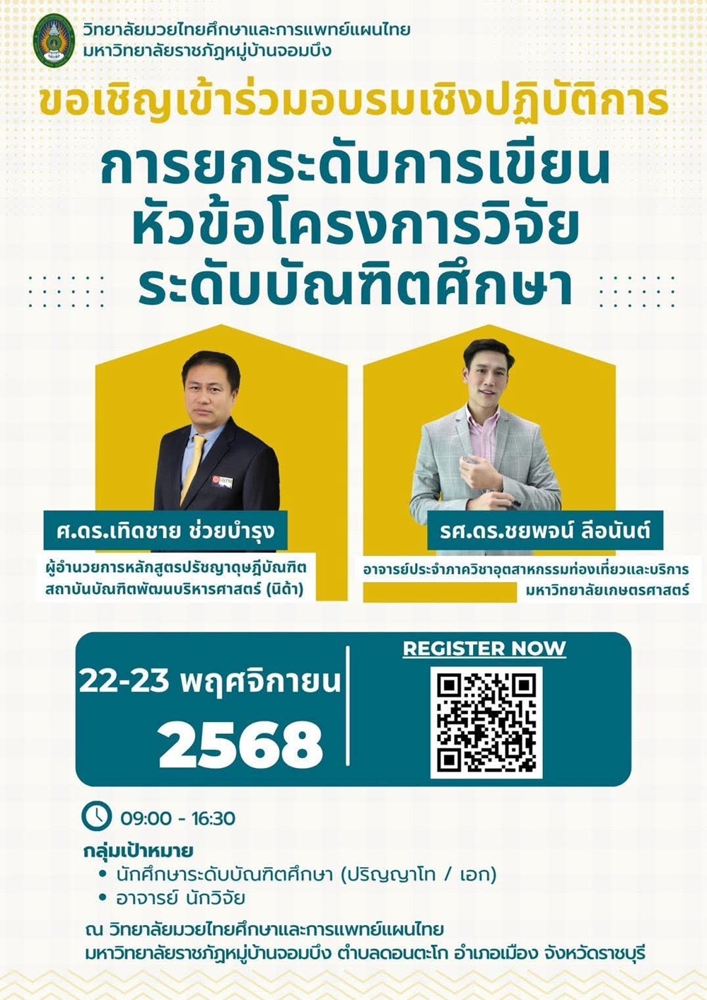 วิทยาลัยมวยไทยศึกษาและการแพทย์แผนไทย มหาวิทยาลัยราชภัฏหมู่บ้านจอมบึง ขอเชิญ นักศึกษาระดับบัณฑิตศึกษา อาจารย์ บุคลากร และผู้สนใจ เข้าร่วมอบรมเชิงปฏิบัติการหัวข้อ “การยกระดับการเขียนหัวข้อโครงการวิจัยระดับบัณฑิตศึกษา” เพื่อเสริมสร้างความเข้าใจและทักษะในการกำหนดหัวข้อโครงการวิจัย ให้มีความเข้มแข็ง ถูกต้องตามหลักวิชาการ และสอดคล้องกับทิศทางการวิจัยยุคใหม่