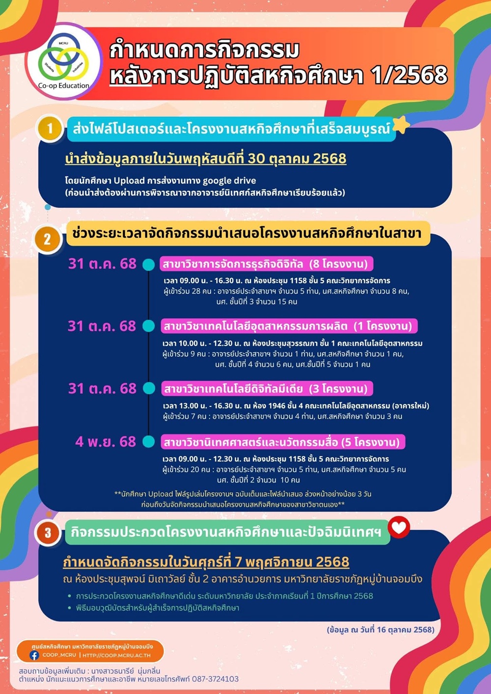 ศูนย์สหกิจศึกษาขอแจ้งกำหนดการกิจกรรมหลังการปฏิบัติสหกิจศึกษา ในภาคเรียนที่ 1/2568