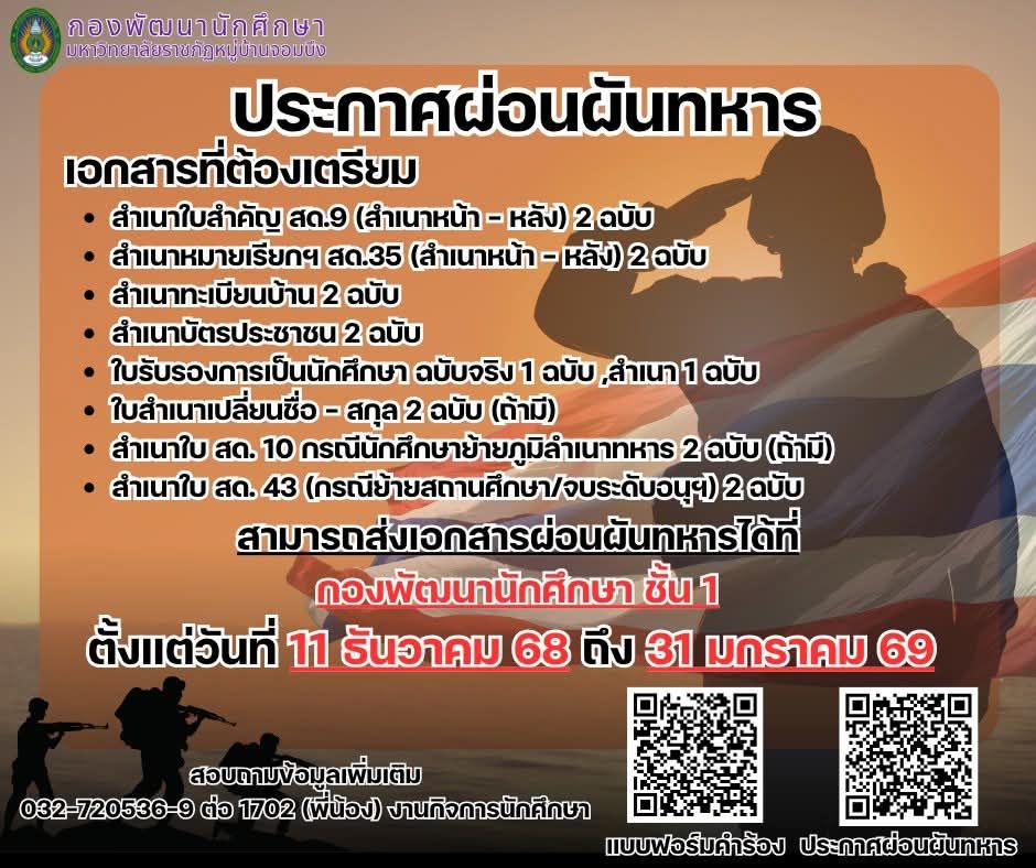 กองพัฒนานักศึกษา มหาวิทยาลัยราชภัฏหมู่บ้านจอมบึง แจ้งให้นักศึกษาชายที่มีความประสงค์ ขอผ่อนผันการตรวจเลือกเข้ารับราชการทหารกองประจำการ ประจำปีการศึกษา 2569 ดำเนินการยื่นเอกสารได้ตั้งแต่วันที่ 11 ธันวาคม 2568 ถึง 31 มกราคม 2569 ณ กองพัฒนานักศึกษา ชั้น 1 อาคารกิจกรรมนักศึกษา